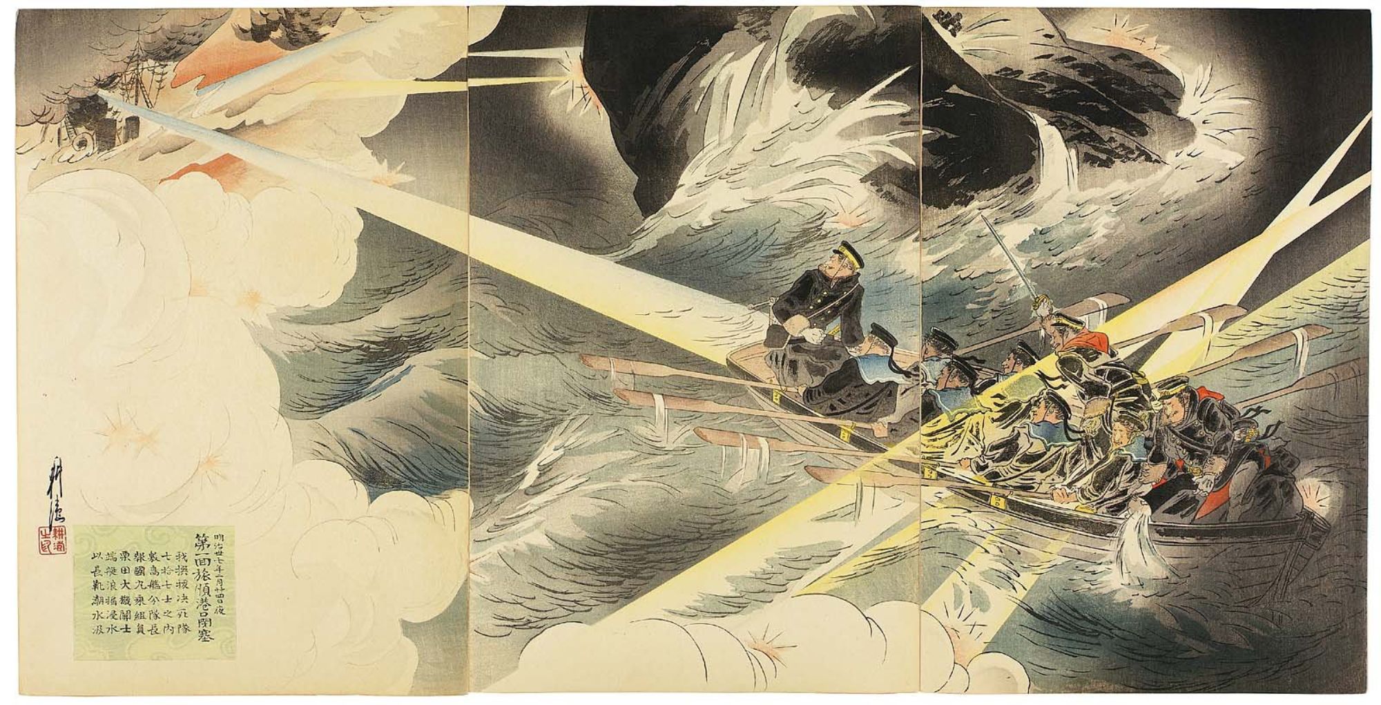 「明治三十七年二月二十四日夜第一回旅順港口閉塞」も三枚続きの版画
