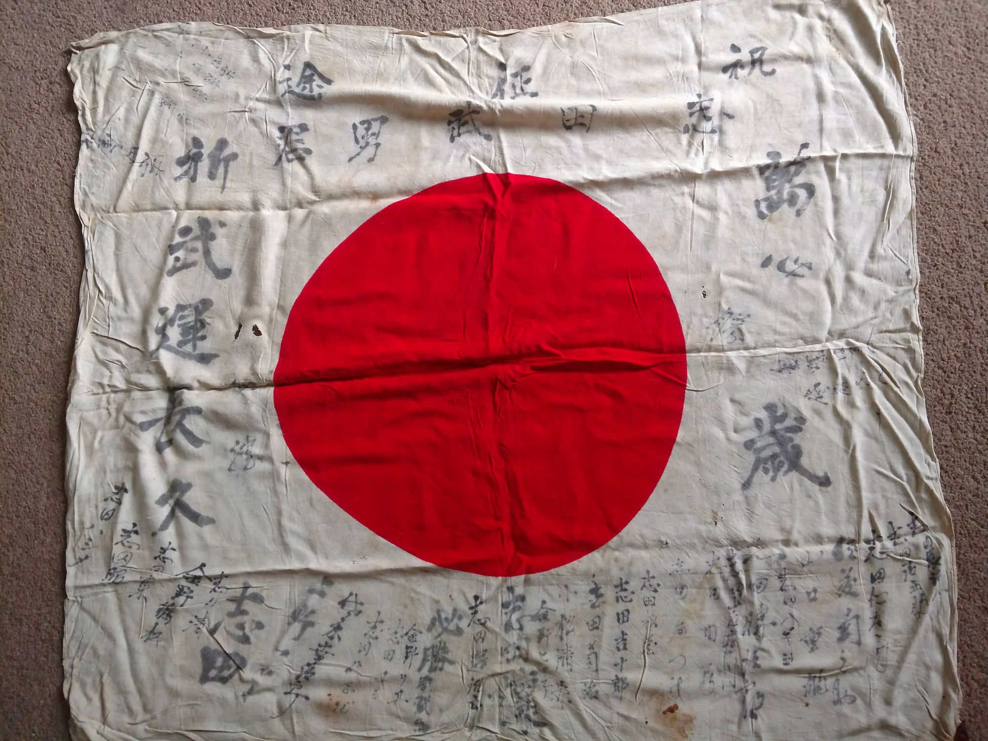家族が兵士のために国旗に寄せ書きして武運を祈るんだ
