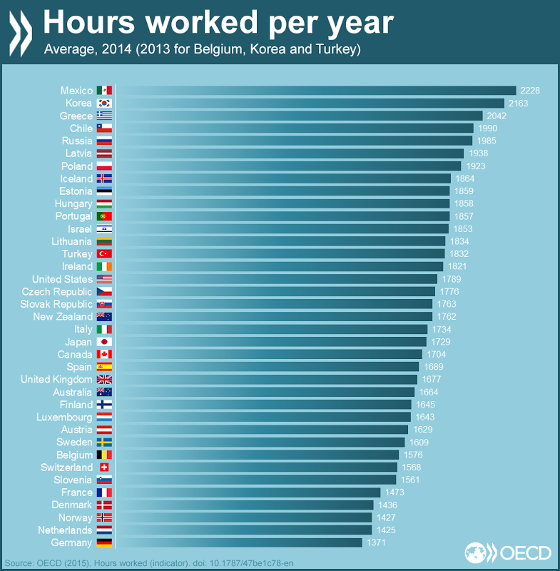 (※主要国における一人あたりの年間労働時間、ドイツは下から2番目)