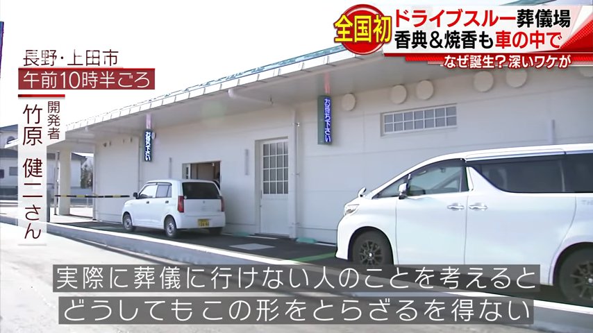 車に乗ったまま葬儀に参列できるドライブスルーシステムを併設した全国初の葬儀場が長野県上田市に完成し、15日に報道陣に公開された。高齢者や障害者でも無理なく葬儀に参列できるようにと、竹原重建の子会社が開発して特許を取得。冠婚葬祭の愛昇殿グループのレクスト・アイが新設の上田南愛昇殿葬儀場に導入し17日から運営を開始する。(日本経済新聞)