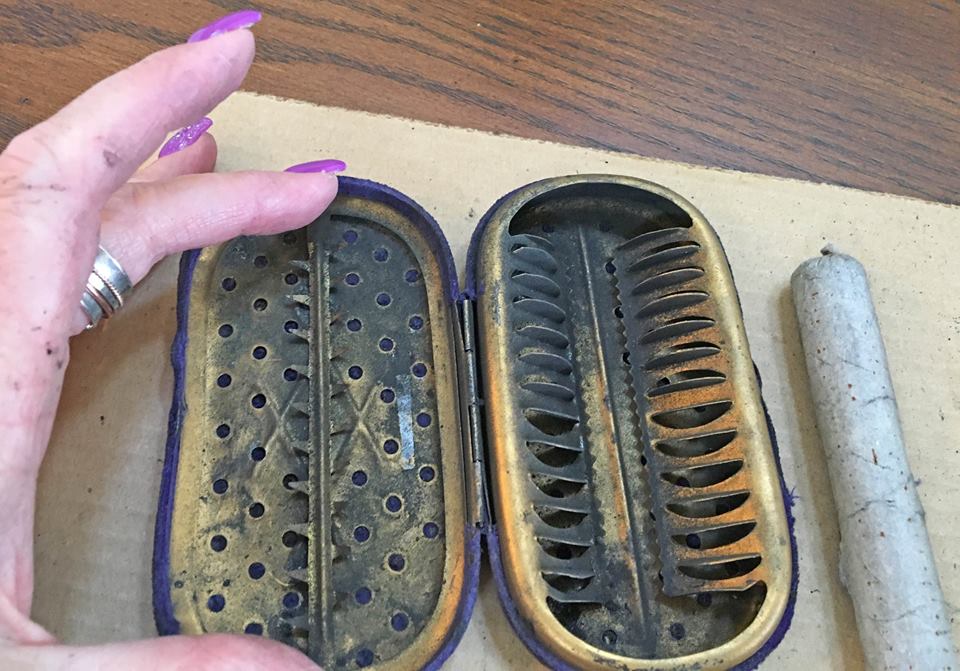 >Hand warmer in believe. Light the tube and it slowly burns like charcoal inside. Keep it in your pocket. My grandmother had one that used black graphite type sticks.