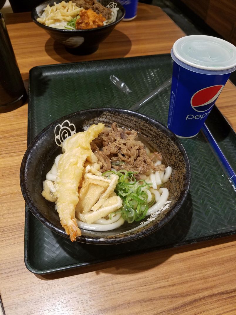 これはハナマルという有名な全国チェーンの牛肉と海老の天ぷらが入ってるうどん