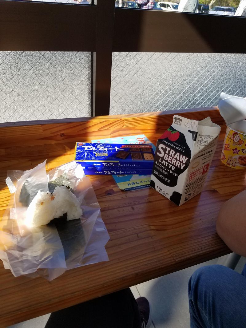 鮭のおにぎり、チョコレート、ストロベリーミルク