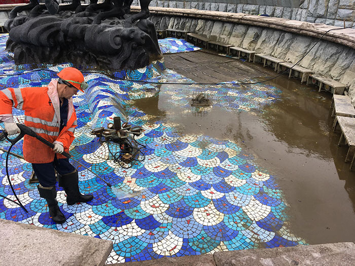 しかし模様タイルや公共のベンチを掃除するのは分かるけど、普通のレンガや墓石は自然に古びるままの方がよさそうだ。