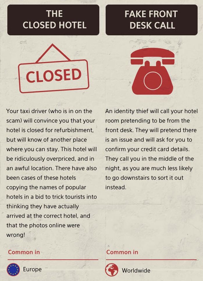 ・泊まるホテルは休業中だとタクシー運転手に言われ高額なホテルに連れて行かれる、名前を似せた別のホテルに連れて行かれることもある(欧州)