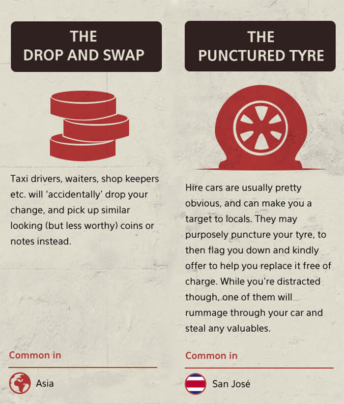 ・タクシー運転手やウェイターが偶然を装いお釣りを落として似たような価値の低い硬貨や紙幣すり替える(アジア地域)