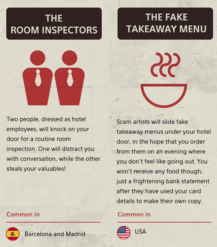 ・ホテルの従業員を装った2人組が部屋の検査と称してやってきて1人が気を引いてる間にもう1人が盗む(バルセロナ、マドリード)