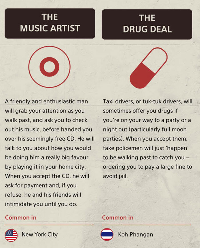 ・偽札をチェックすると言うニセ警官に金を渡すと中身を抜かれる、罰金を取られる場合もある(メキシコシティ、ボゴタ、ブカレスト、バンコク)
