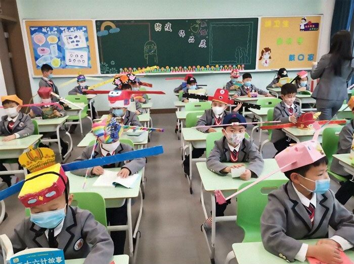 これは手作りの”1メートル帽子”で新学期を迎えた杭州の小学校
