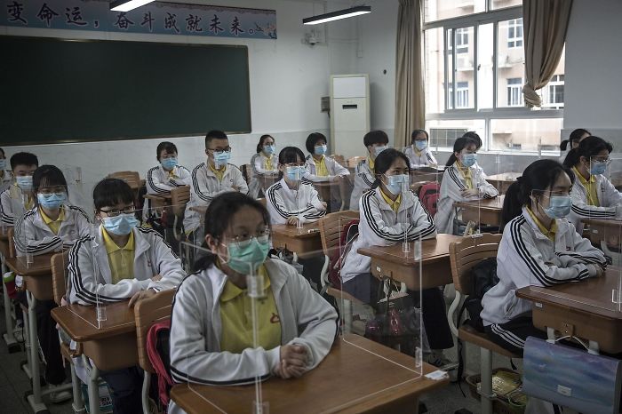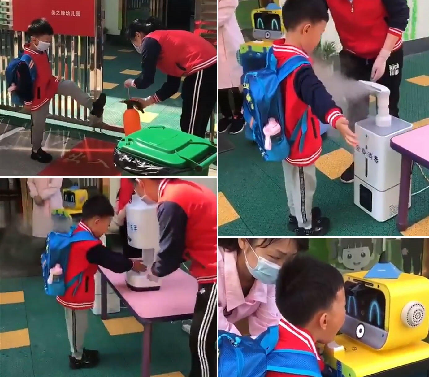 学校が再開した中国では生徒がまず靴に消毒スプレー