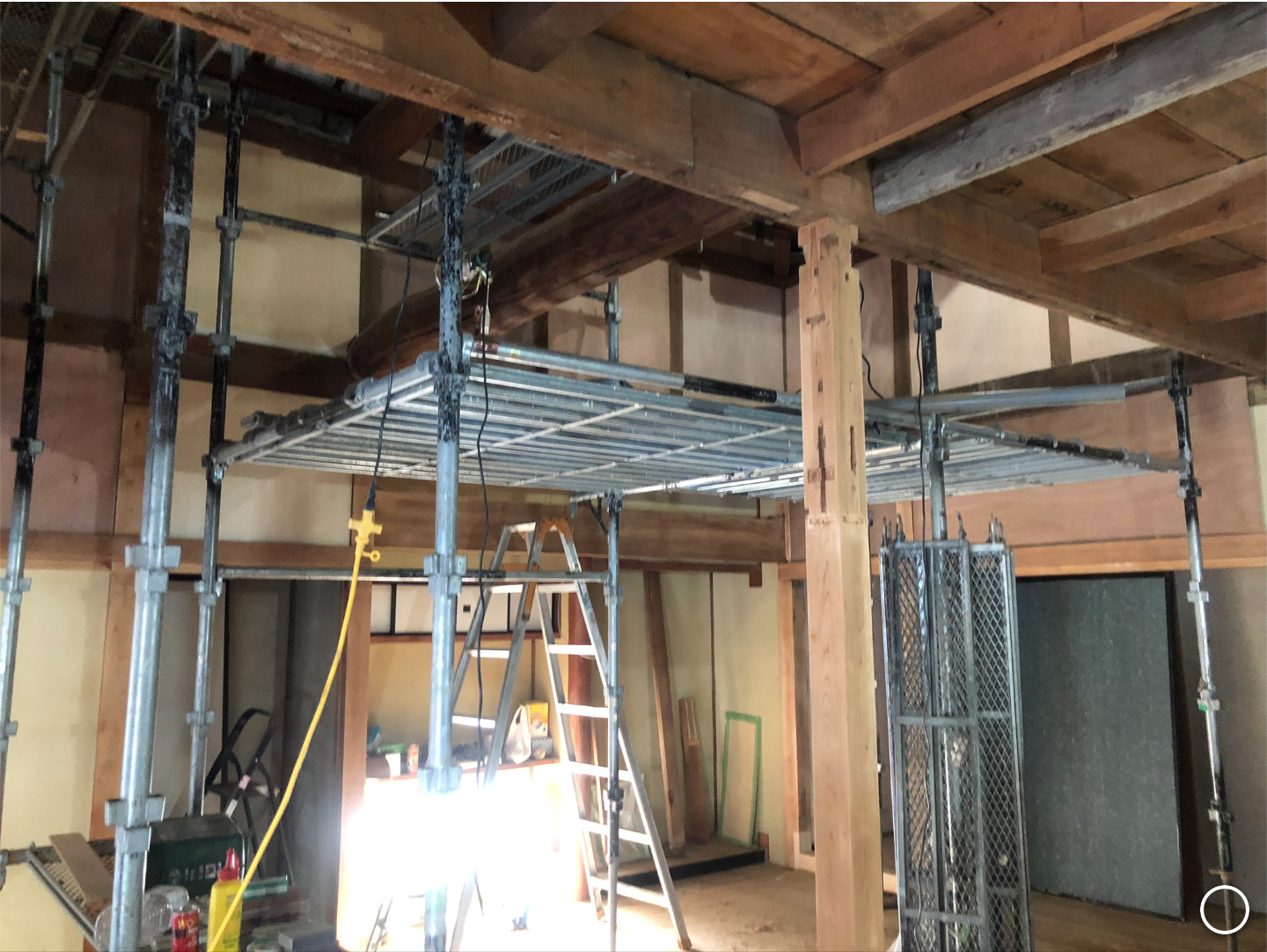 足場はこうやって置かれ、上のほうにある壁は塗装可能で柔軟な薄いベニヤ板で修繕