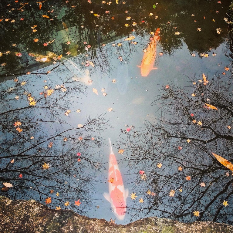 自分が撮影した空が反射する池の鯉