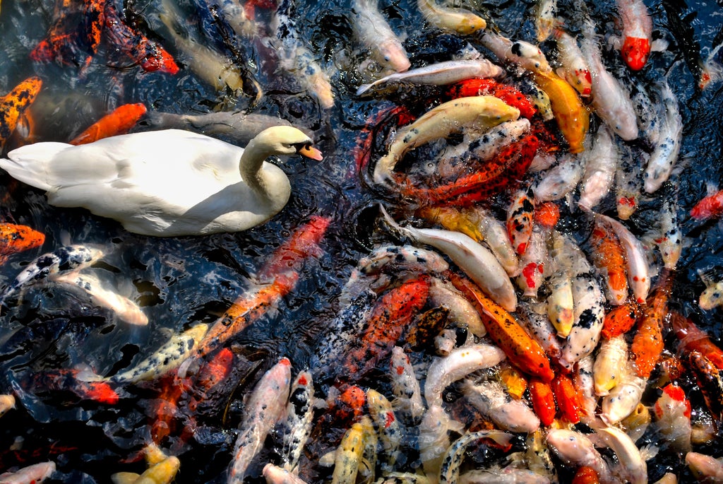 鯉の中を泳ぐ白鳥