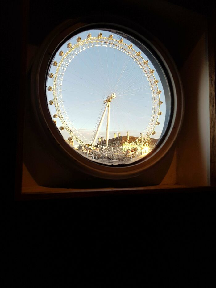 テムズ川で船の窓越しに撮影したロンドンアイ