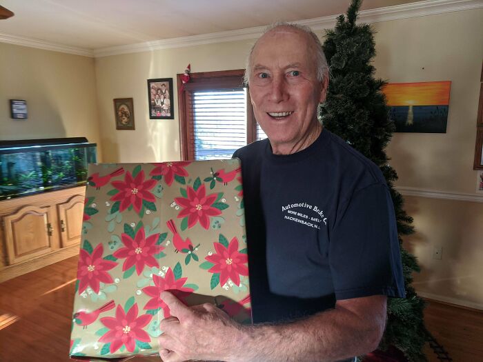 ラッピングの紙がピッタリ揃って超ウキウキのパパ