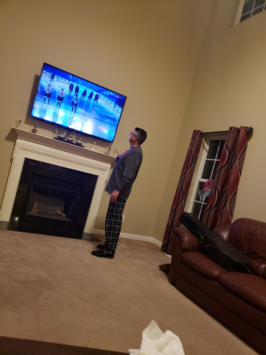 ゲイリー父さんは腕組みをしながら立ってテレビを見る