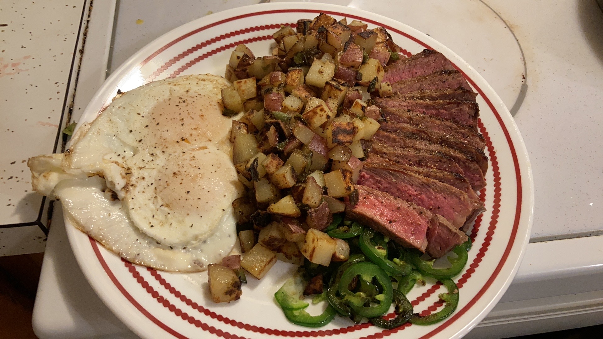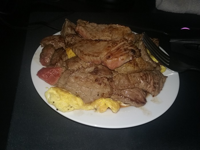 卵4個、塩コショウで素早く焼いた少量のサーロインだ