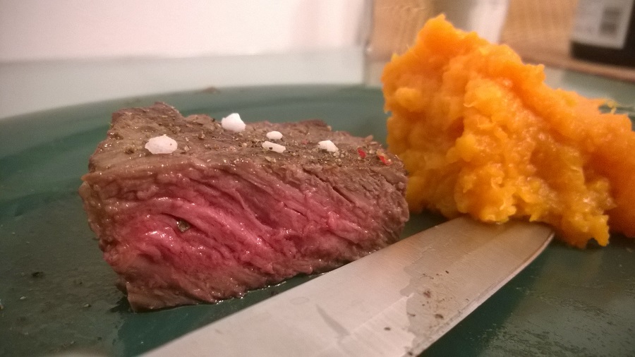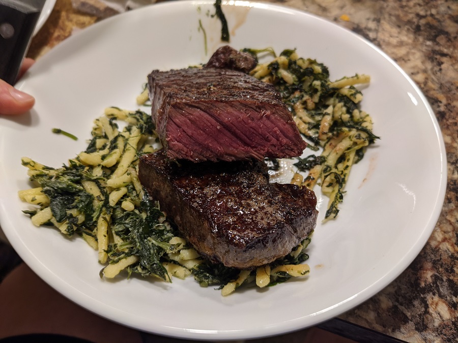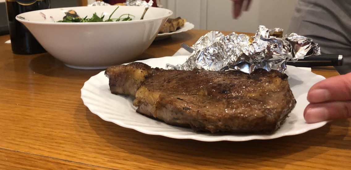この肉質ならナイフを使わず食べられるサイズにカットして、中に肉汁を閉じ込める焼き方の方が旨いと思うんだが。