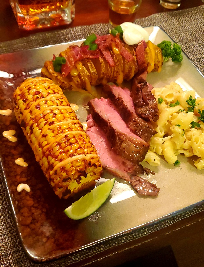 トライティップステーキ+ハニーチリコーン+ハッセルバックポテト+マカロニ