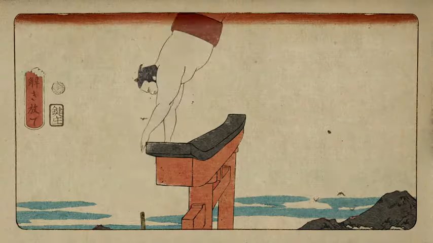 五輪のワクワク感を演出するのにオリジナルの版画を邪魔しない力士の作画のタッチや日本らしい竹とそれをスピード感をもって利用しての鳥居での棒高跳びへの繋がりなど、素晴らしい動画じゃないか。