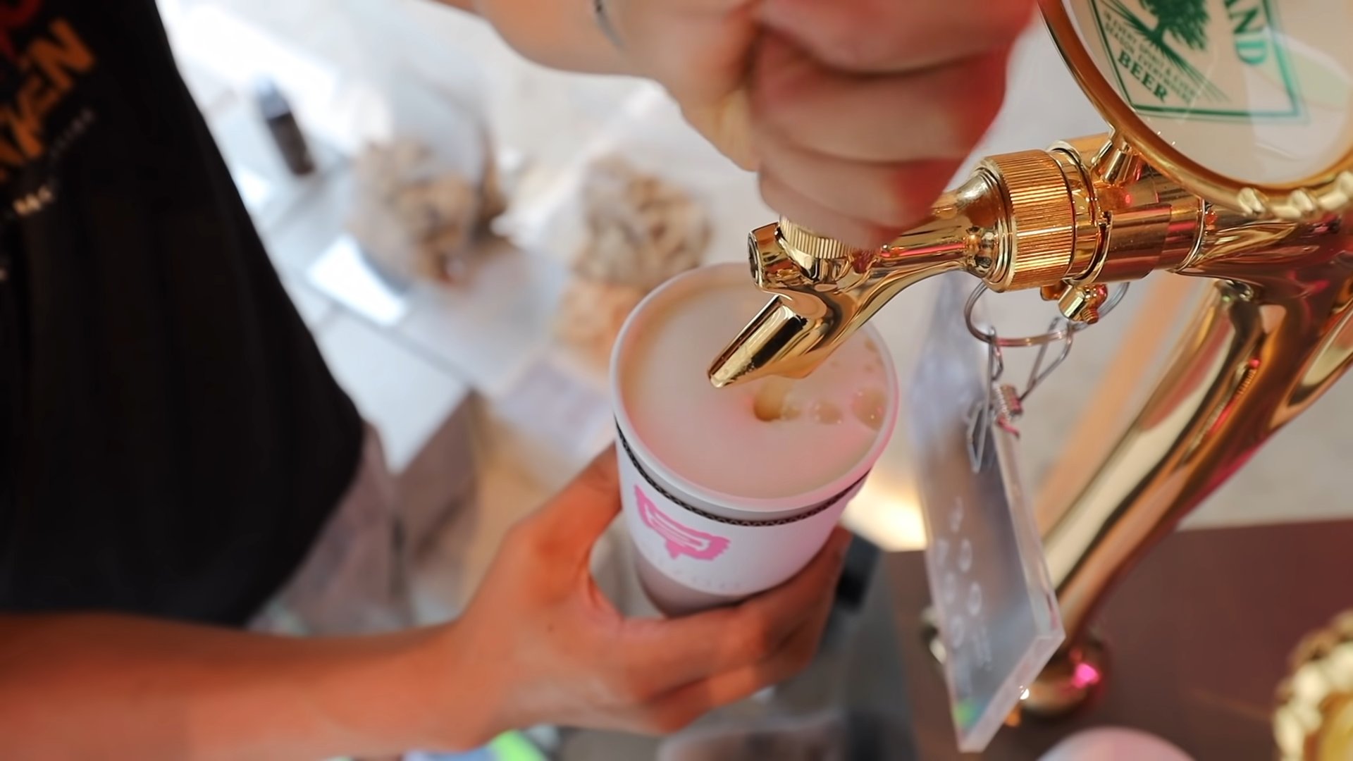 紙コップを取って端末で支払いをしてビールを注ぐ