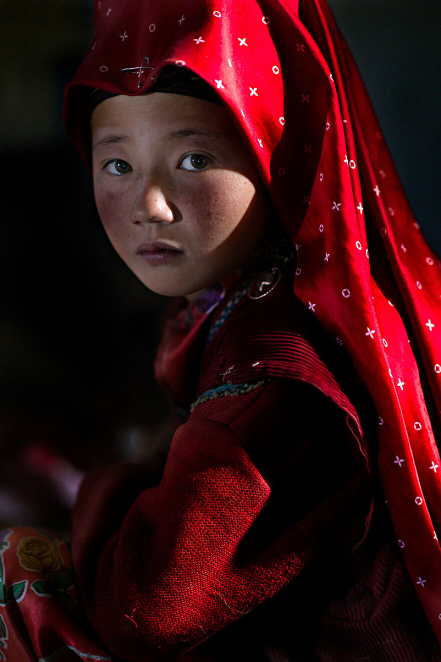 アフガニスタン高地の山で出会った赤い装束の少数民族の女性