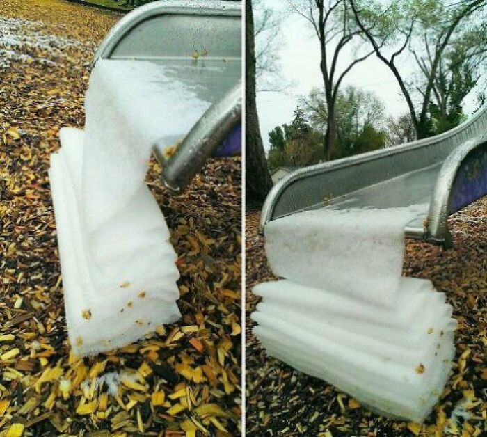 滑り台から滑ってきた雪