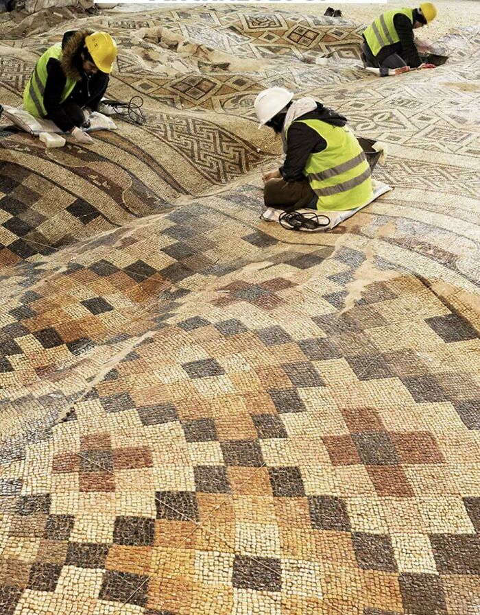 トルコの地震で波打ったモザイク画を一旦掘り抜いてる様子