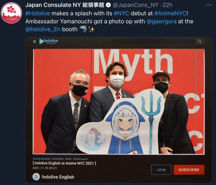 スレッド「ニューヨークで日本の大使と一緒にポーズを取るVチューバーのがうる・ぐら」より。