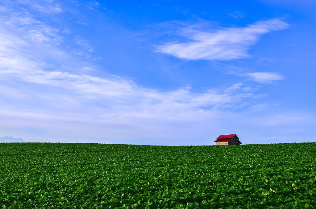 北海道・美瑛の緑に囲まれた赤い小屋