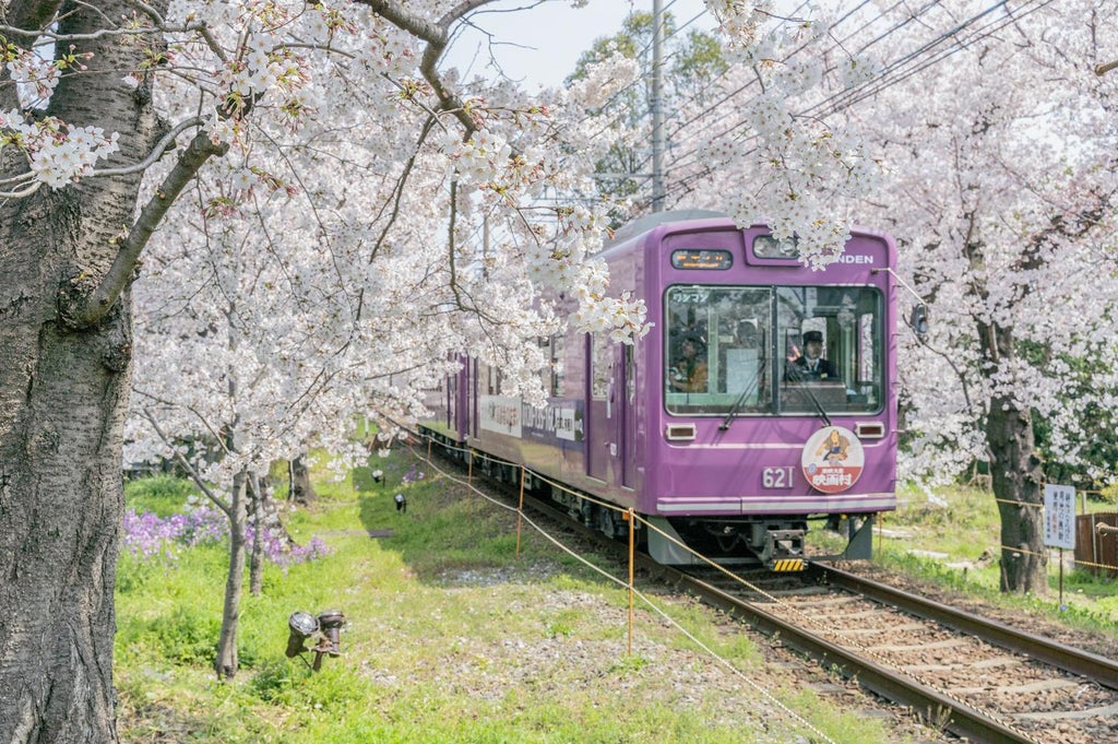 桜のトンネルを通る京都の嵐電