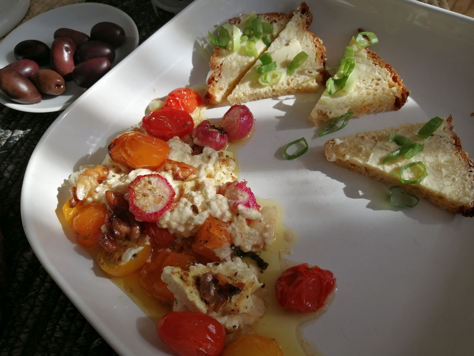 焼きトマト、ホウレン草、ニンニク、ヨーグルトに浸けて焼いたチキンだ