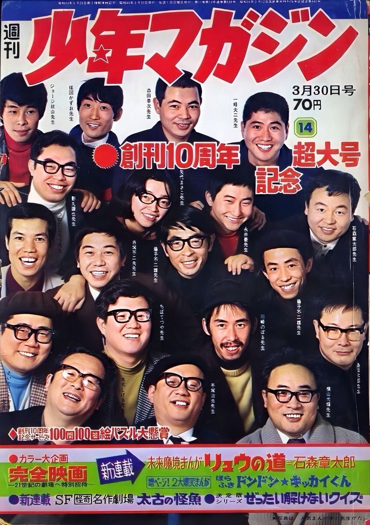 手塚治虫、石ノ森章太郎(仮面ライダー)、赤塚不二夫(おそ松くん)、藤子F(ドラえもん)