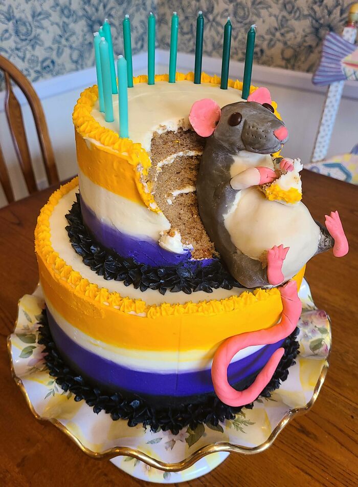 完成したケーキに乗っけるかと思いきや、ネズミの「ちょっと食べたよ」という雰囲気を出すユーモアさがgood。