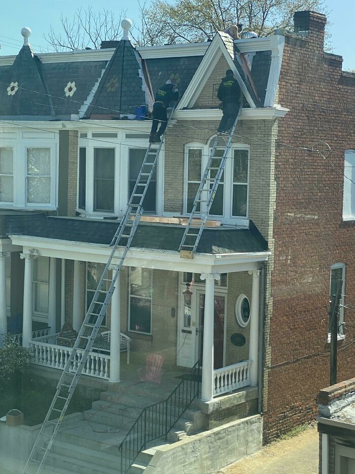 向かいの家にハシゴをかけて仕事をする屋根職人をヒヤヒヤしながら見てた