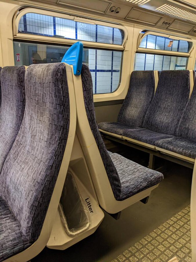 この電車は座席の間のスペースをゴミ箱として利用していた