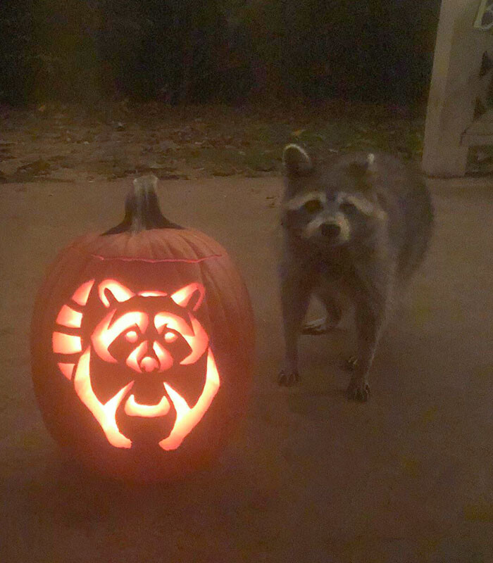 今日の夜、私と夫が彫ったジャック・オー・ラクーンの隣にアライグマが現れた