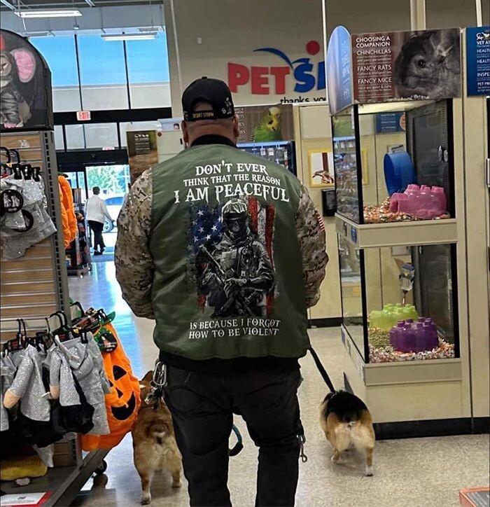 俺が平和的だと思わないことだな(ペットショップで2匹のコーギーを連れながら)