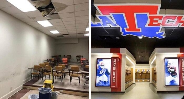 左が大学の教室、右が同じ大学のアメフトチームのロッカールーム