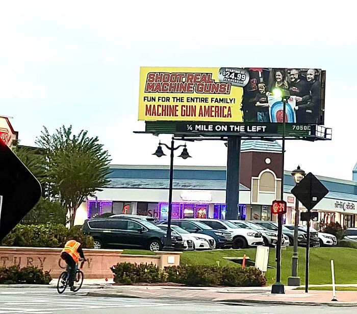 看板「24.99ドルで本物のマシンガンが撃てる!家族全員で楽しもう!」