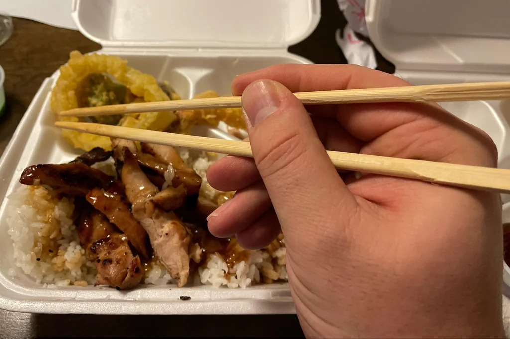箸の下の方を持って、コメをガツガツ掻き込むように食べてるんだろうな。