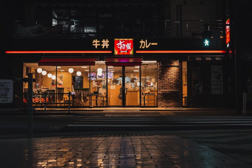 ありふれた牛丼屋がアニメの名シーン背景っぽいいい雰囲気になってる