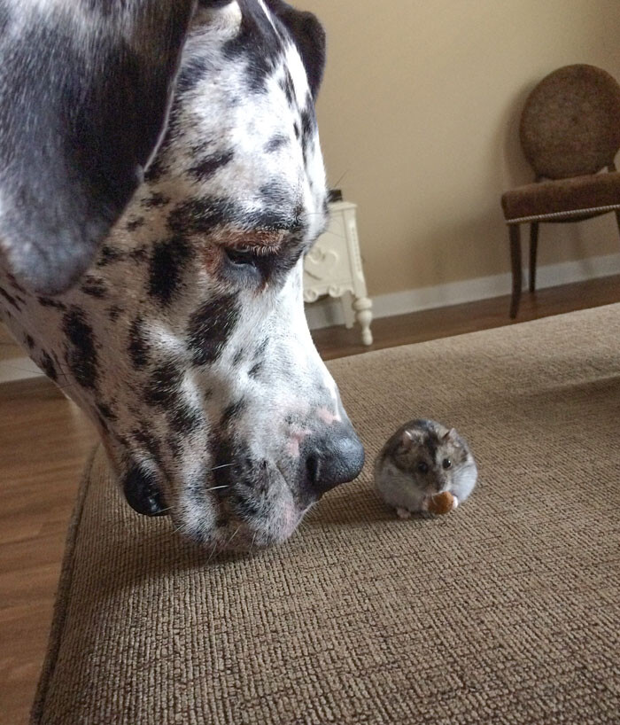 エサを食べるハムスターに嫉妬するうちのグレート・デーン