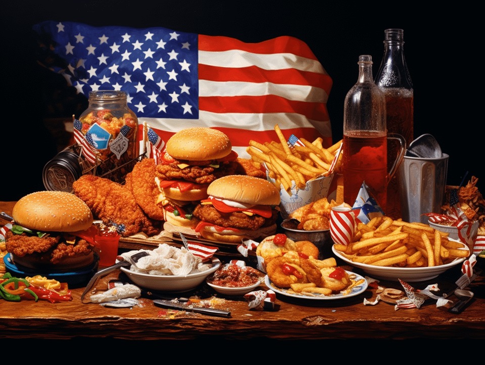 国旗をバックにアメリカ料理ってwアメリカの特色はアメリカという事だけなんだよな