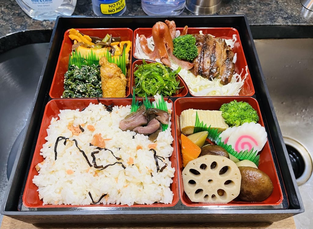 特に右手前のコーナーの煮物の具材の彩り、バランス、炊き具合はどう見ても手慣れた職人のものだ。素人臭いといえば、タコさんウインナーの刃物の入れ方か?