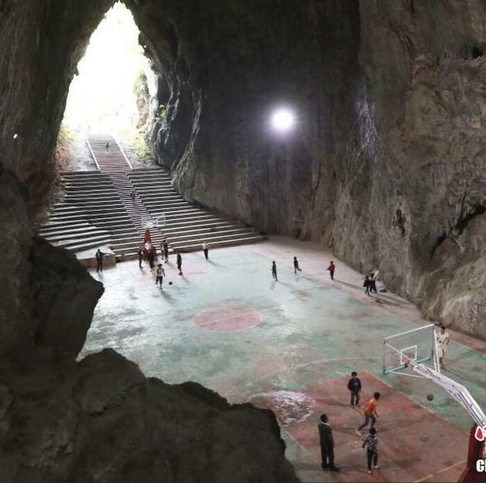 洞窟の中にあるバスケットコート