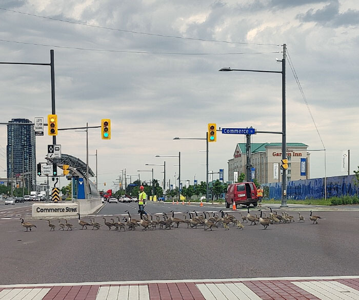 ガチョウ(カナダガン)の群れの横断を手伝った建設作業員に多大な敬意を払いたい