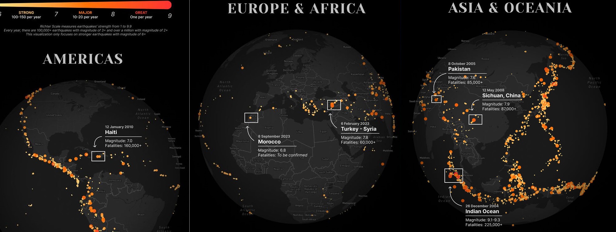 M6以上の地震が起きた場所(アメリカ大陸・欧州アフリカ・アジアオセアニア)