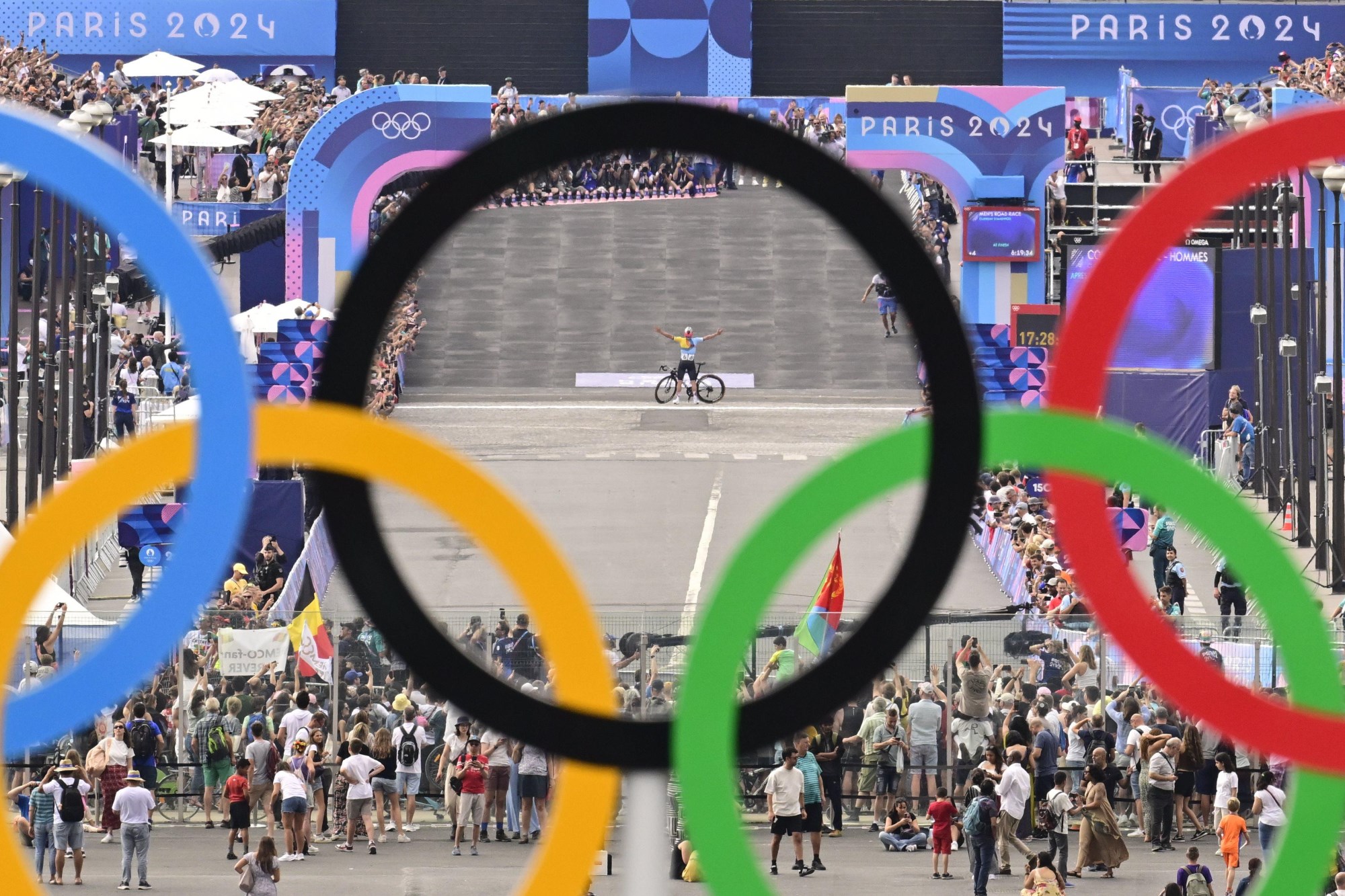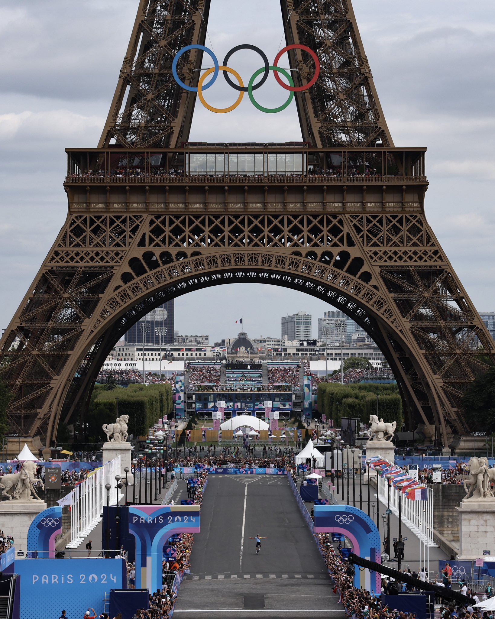 2位以下が写る前にゴールラインでエッフェル塔を背景に記念撮影