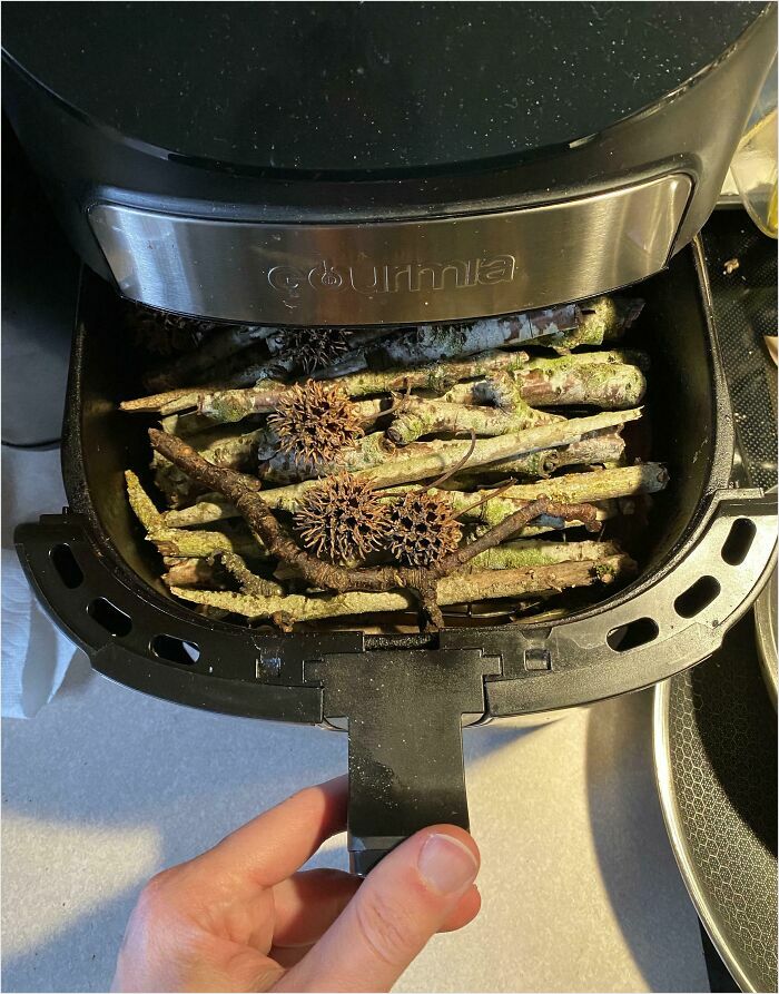 ルームメイトがエアフライヤーで適当な枝や木の実を乾燥させようとしてた